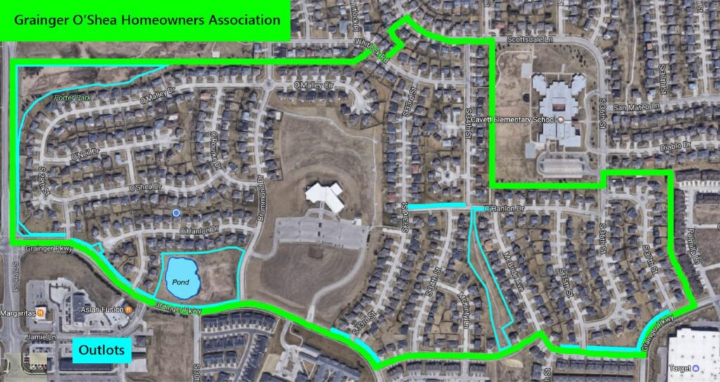 The Grainger O’Shea Homeowners Association Board of Directors are responsible for the pond and surrounding area near Grainger Boulevard and Brummond Drive; The “happy valley” area between McBride Avenue and McKinty Lane (just north of Grainger Boulevard) and an assortment of out-lot areas including traffic circles around the neighborhood
